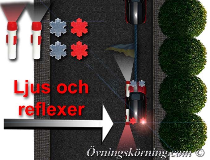 Sätta vita reflexer och en vit lykta fram på bilen och röda reflexer och en röd lykta bak på den bogserade bilen.