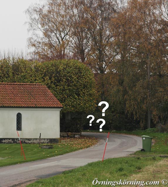 Du vet ju inte vad som finns på andra sidan? Där är kanske en traktor eller en lastbil som du snart kommer att möta? Risken är att dom på grund av sin bredd täcker upp hela vägen när ni möts.